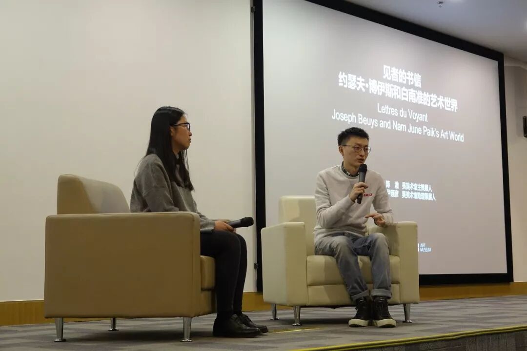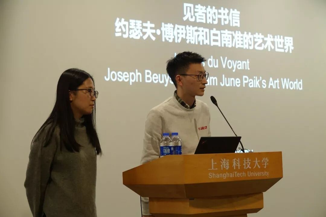 3月8日下午,昊美术馆主策展人陈澈和助理策展人尹颋彦来到上科大,与大家分享了昊美术馆目前正在举行的当代艺术特展——“见者的书信:约瑟夫·博伊斯×白南准”,同时把二者晦涩的作品放在各自当时的语境中,慢慢连成了贯穿其一生的“句子”。千变万化的“字”难以捉摸,但当从“句”的维度便简单了许多。两位策展人便是通过这种方式带我们走到当代艺术盛行的上世纪,与大师谈笑风生。