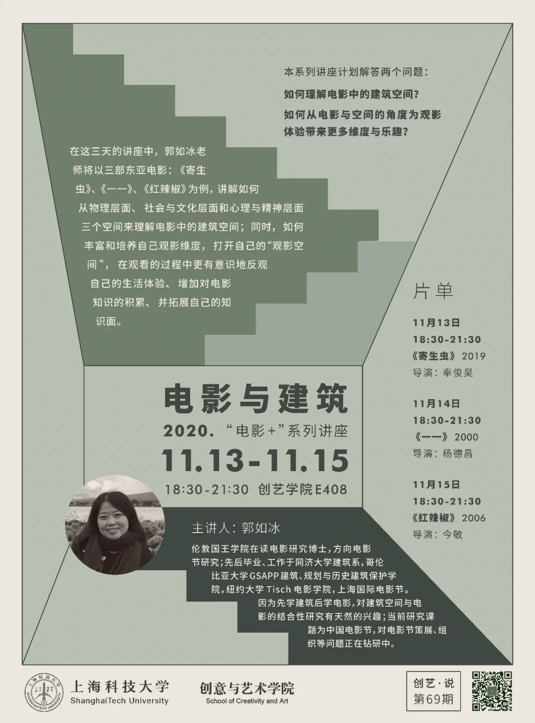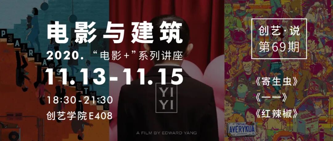 本次创艺·说,主讲人郭如冰老师将用三天、三部经典的东亚电影:《寄生虫》、《一一》、《红辣椒》为例,讲解如何从物理层面、社会与文化层面和心理与精神层面的三种空间,来理解电影中的建筑空间。